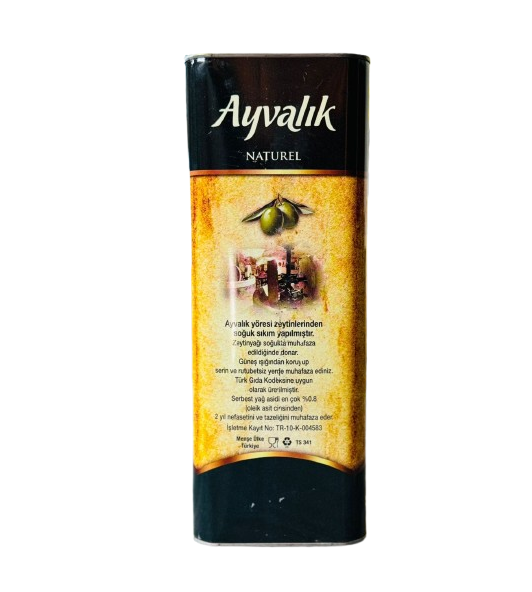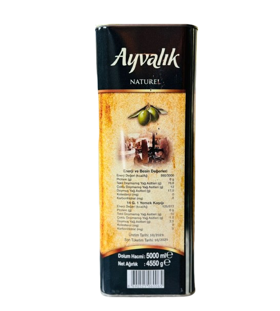 • Ayvalık Natural Extra Virgin Olive Oil 5 Lt Product Type: Natural Extra Virgin Olive Oil Packaging: 5 LT Tin Consume Reliable, Delicious, Registered and Genuine Olive Oil Natural Extra Virgin Olive Oil is an indispensable taste of the tables with its delicious smell and perfect taste.