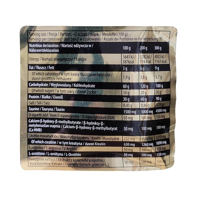 Ingredients: Maltodextrin, protein complex [whey protein concentrate 80 (from milk), buttermilk, whey protein isolate (from milk), hydrolysed whey protein concentrate (from milk), micellar casein (from milk)], cocoa1, taurine, D-aspartic acid (DAA), calcium β-hydroxy-β-methylbutyrate (Ca HMB), creatine monohydrate, L-arginine, L-ornithine, Fenugreek extract (Trigonella foenum-graecum L.), thickener (xanthan gum), red beet juice concentrate7,10, flavourings1,2,3,4,5,6,7,8,10,11,13,14,15, flavouring9,12, cocoa12,13, instant coffee14, colour/s (E150c2,3,11, E160a3,4,15), salt, sweetener (sucralose).
