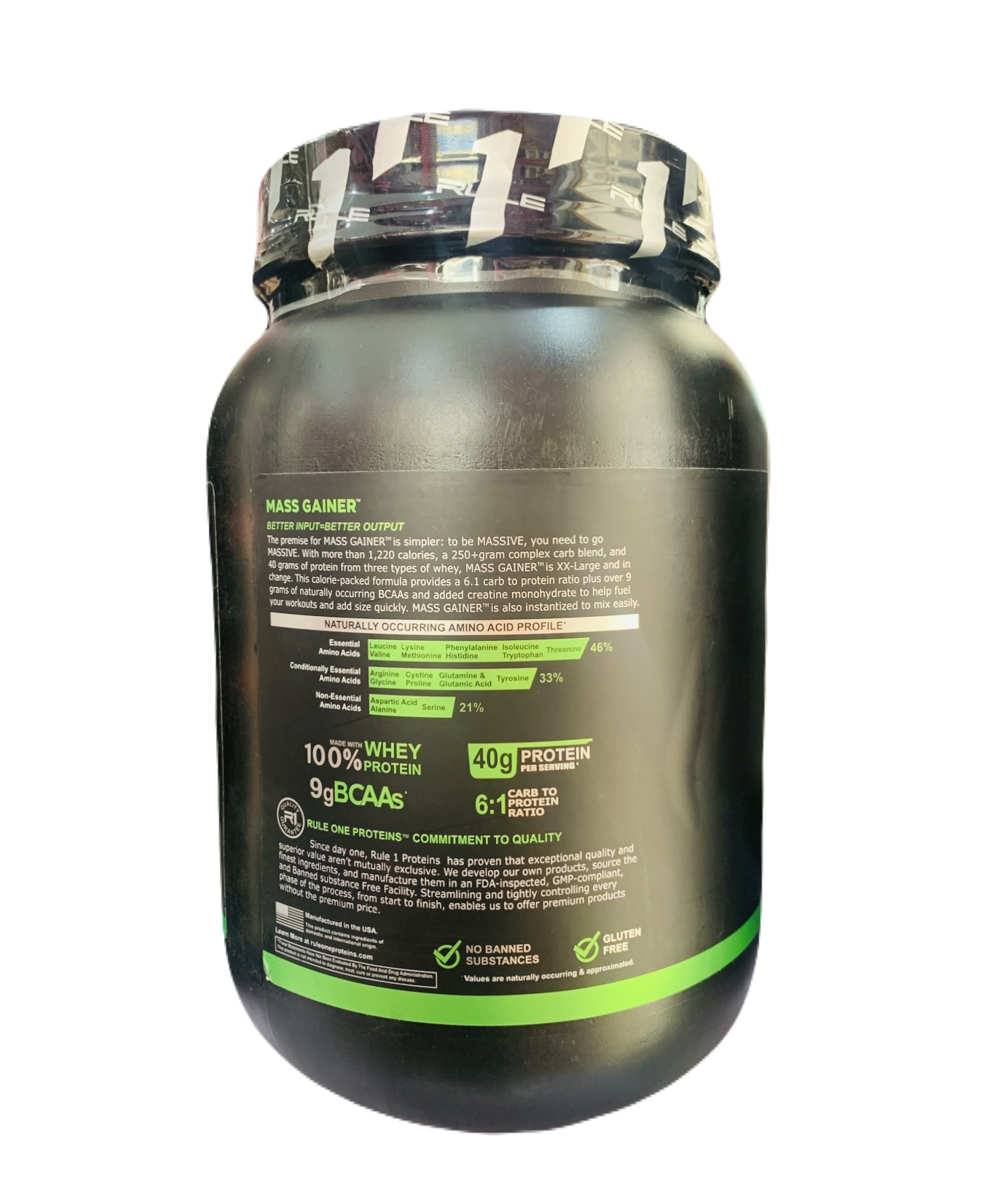 • ACCELERATED GAINS – With over 1,220 calories, more than 250g carbohydrates, and 40g protein from three types of whey, R1 Mass Gainer puts you in charge of transforming to XXL.